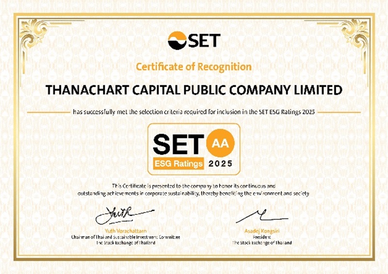 บริษัท ทุนธนชาต จำกัด (มหาชน) หรือ TCAP ได้รับการประเมินหุ้นยั่งยืน “SET ESG Ratings” ในระดับ “AA” ประจำปี 2568 เป็นปีที่ 2 และอยู่ในรายชื่อหุ้นยั่งยืนของตลาดหลักทรัพย์แห่งประเทศไทย (SET) อย่างต่อเนื่อง โดยเป็น 1 ใน 265 บริษัทที่ได้รับการคัดเลือกในปีนี้ รางวัลนี้สะท้อนถึงพัฒนาการที่โดดเด่นและความมุ่งมั่นในการดำเนินงานด้านความยั่งยืนอย่างครอบคลุม ทั้งมิติสิ่งแวดล้อม (Environmental) สังคม (Social) รวมถึงการบริหารงานตามหลักบรรษัทภิบาล (Governance) หรือ ESG ของ TCAP ที่ผ่านมา